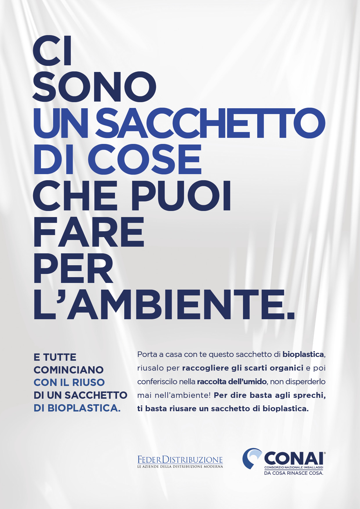 La campagna invita i consumatori ad un uso più consapevole delle tre tipologie di sacchetti: quelli di plastica ultraleggeri per gli alimenti sfusi, tipici dei reparti ortofrutta, gastronomia e panetteria, in materiale compostabile, che si conferiscono con la frazione organica dei rifiuti domestici. Quelli di plastica per il trasporto, biodegradabili e compostabili, distribuiti soprattutto alle casse, riutilizzabili per la raccolta differenziata dell’organico. E quelli in plastica riutilizzabili, da utilizzare più volte per la spesa o riusare per altri scopi, da differenziare nella plastica una volta rotti.