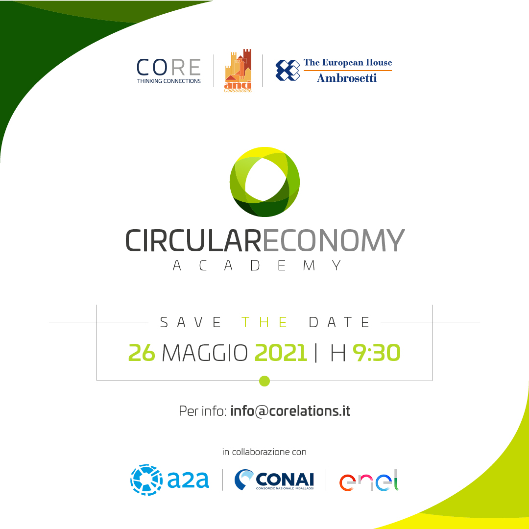 Mercoledì 26 maggio dalle 9.30 alle 13.30 si terrà la prima sessione della Circular Economy Academy di Core, ANCI ed European House Ambrosetti in video conferenza, in cui si discuterà di “Economia circolare, strumenti e strategie per far crescere l’Italia“.