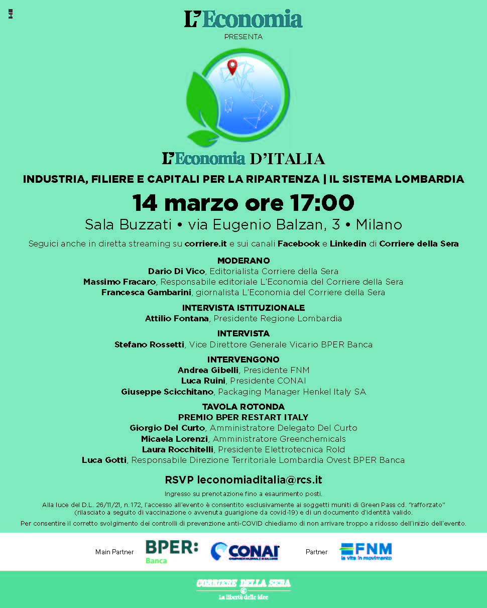 Il 14 marzo alle ore 17:00 si terrà Milano il primo incontro dell’anno de L’Economia d’Italia, l’evento a tappe sul territorio de L’Economia del Corriere della Sera, che parte proprio dalla Lombardia per parlare di “industria, filiere e capitali per la ripartenza”.