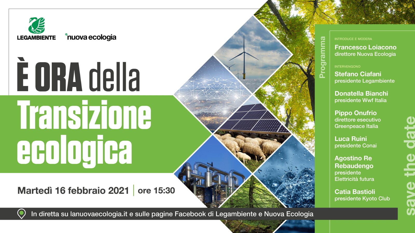 Martedì 16 febbraio alle ore 15:30 si terrà l’evento in live streaming “E’ ora della transizione ecologica”, organizzato da Legambiente, che sarà possibile seguire in diretta su https://www.lanuovaecologia.it/ e sulle pagine Facebook di Legambiente e La Nuova Ecologia.